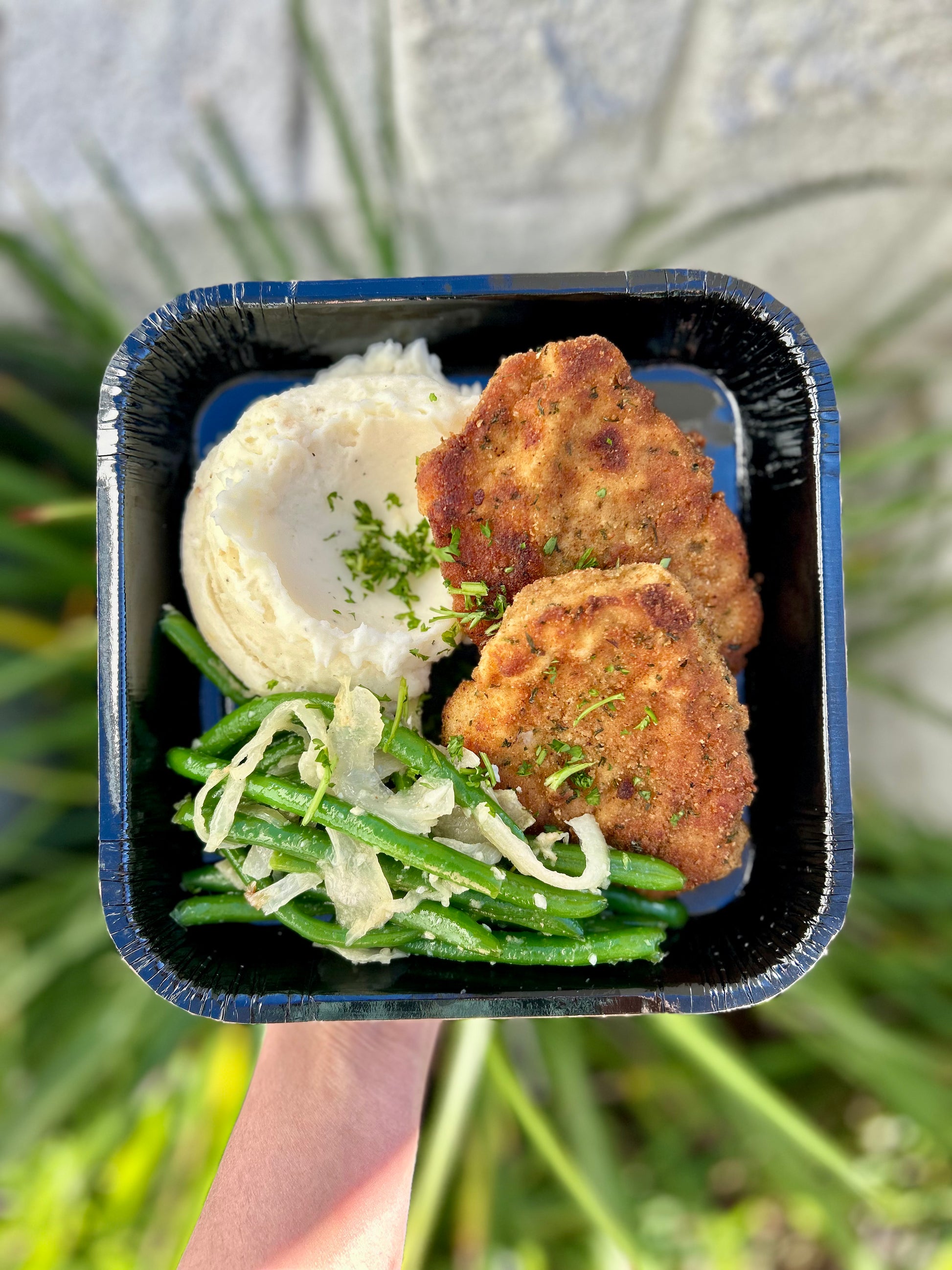 Pork Tenderloin Cutlet with mashed potatoes and sauteed green beans.